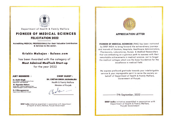 In 2022, BULAAO Medtech was recognized as the 'Most Admired Medtech Start-up' by the Government of Punjab, presented by the Minister of Health and Family Welfare. This award highlights BULAAO’s impactful work in improving healthcare accessibility by connecting patients with skilled professionals for pre and post-operative care and support, making a difference in the community.