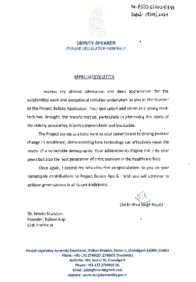 I was given an appreciation lettter by the Deputy Speaker of the Punjab Legislative Assembly, Shri jai Krishan Singh Rouri for my BULAAO project and the impact that it has had on the people.