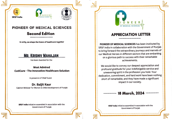 In 2024 CutiCure was awarded with the Most Admired CutiCure - The Innovative Healthcare Solution by Dr. Baljit Kaur, Cabinet Minister for Women and Child Development, Government of Punjab.